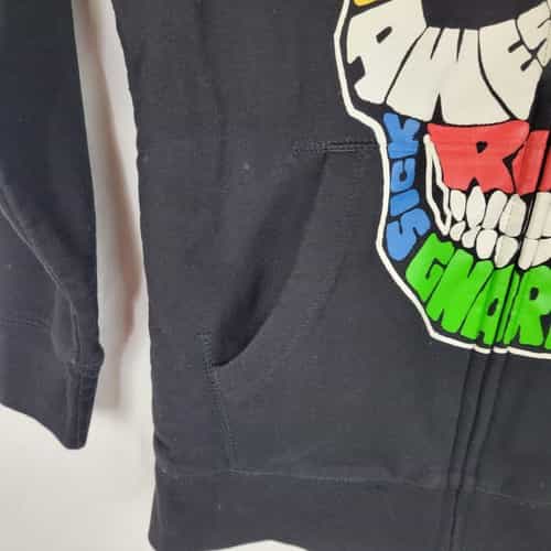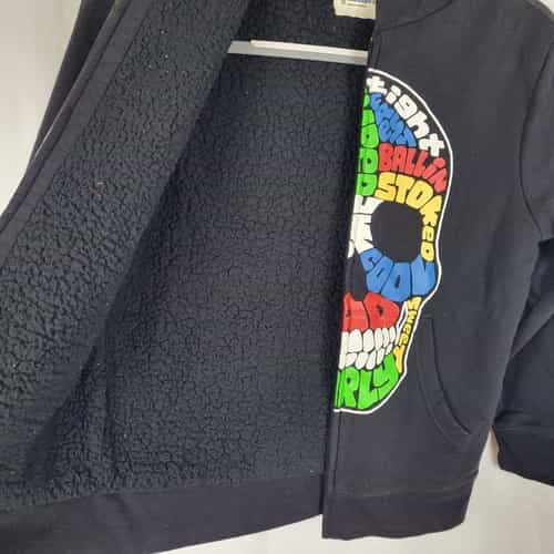 Cotton-blend black zip front hooded jacket with a colorful skull face graphic….soft and snuggly perfect for those breezy fall days!