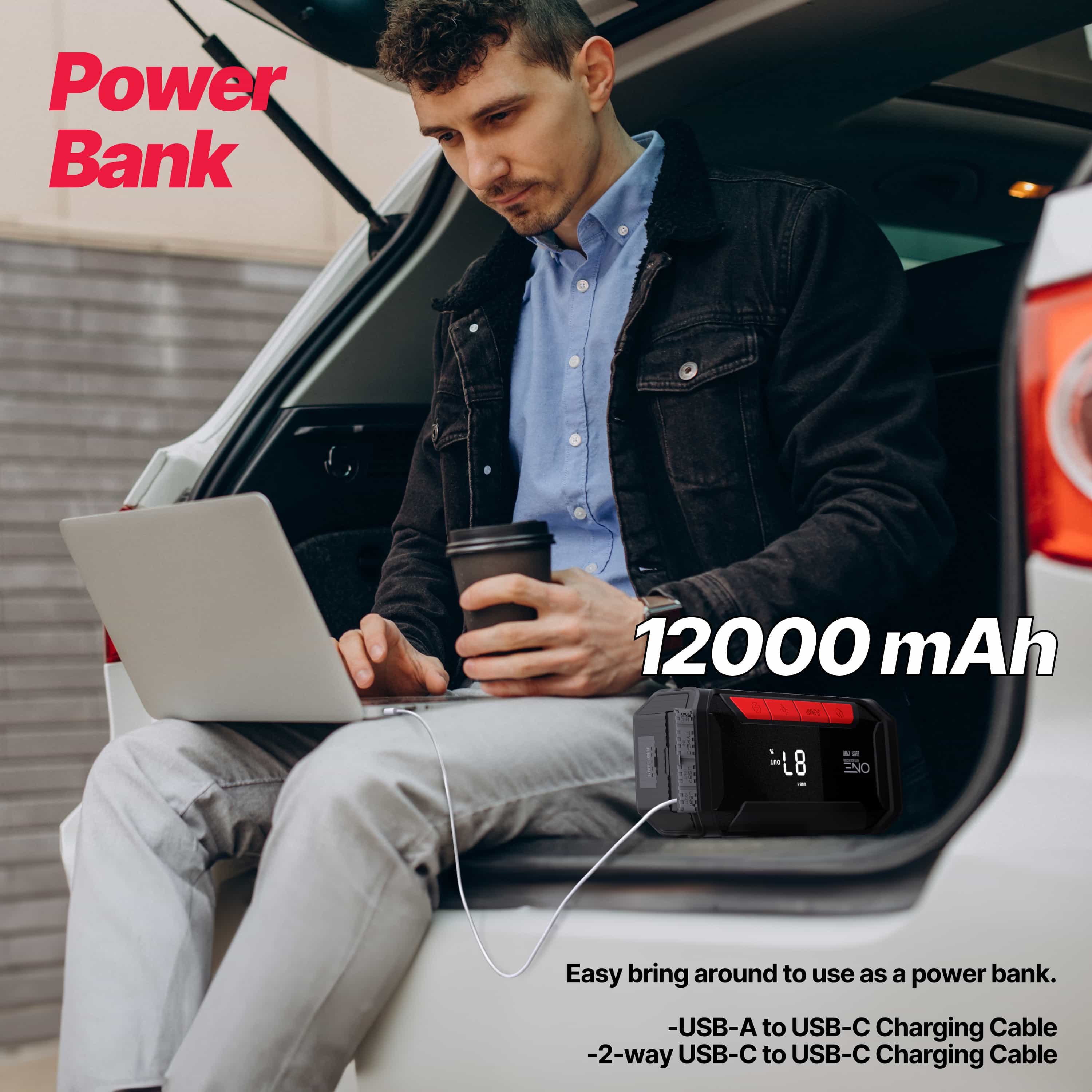 12000mAh/12V Start: Boast a powerful 600A starting point that will jumpstart your car, truck, motorcycle, and more. With a peak rate of 1200A and 2 USB-A outlets & 1 USB-C outlet you can charge multiple devices at the same time.