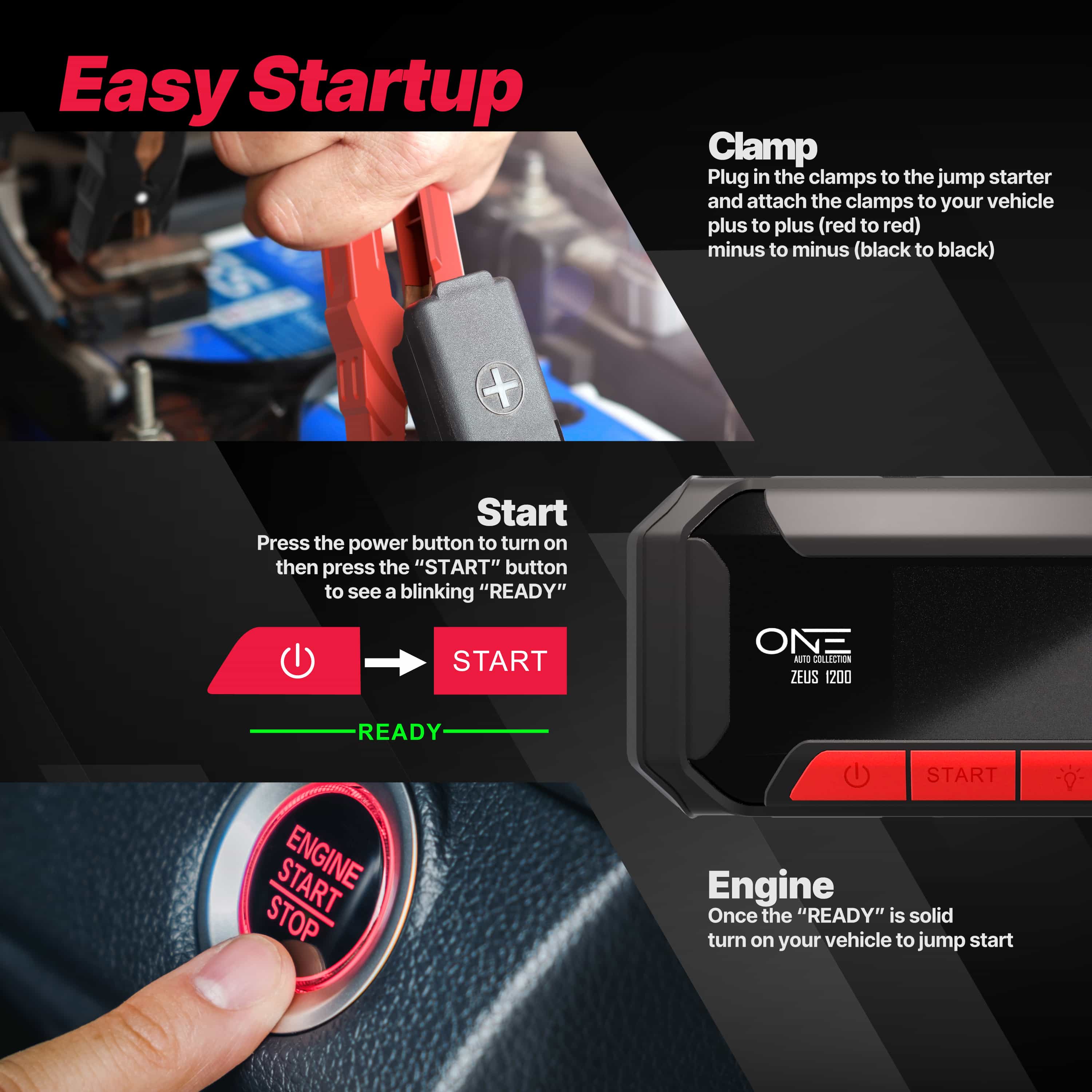 Introducing the ONE 1200A Jumpstarter, perfect for long trips, road trips, or simply just to keep in the car in case of emergencies. This powerful 12000mAh/12V jumpstarter has a Start of 600A and a Peak of 1200A, making it compatible with 7L Gas and 5L Diesel engines. It also features a 65W fast charge, two USB-A outlets, and one USB-C outlet for more power and efficiency. With an easy-to-use LED light, it can be manually set to light, blinking, or SOS lighting mode, perfect for any situation. Plus, thanks to its portable hard case for easy carrying and dust tight seal, it won’t let you down no matter where you are. Furthermore, the ONE 1200A is also equipped with reversed connection protection, overload protection, and short-circuiting protection with power cut offs to prevent internal damage and overheating, making it the perfect reliable jumpstarter.