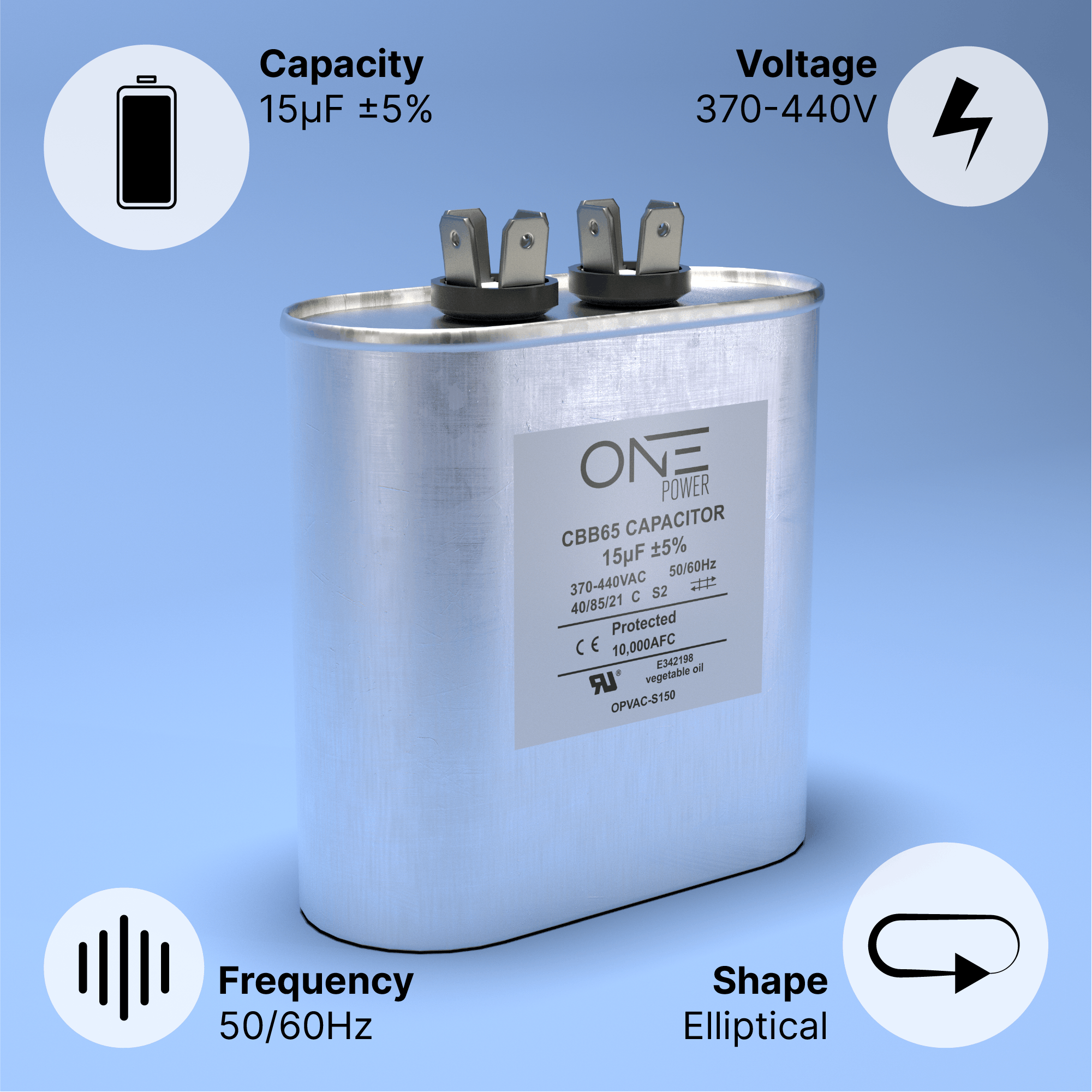 ✅Specifications: 15 MFD capacitance, 440V AC rated voltage, 50/60Hz frequency, and a case size of 1.77-in W x 3.54-in H.