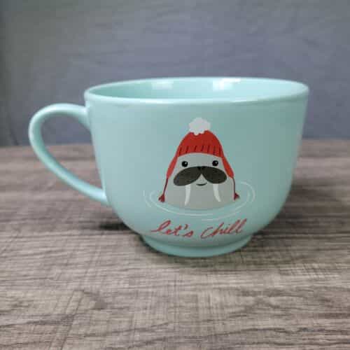 Pretty teal mug with a walrus wearing a cool cap! A fun mug that will be sure to create conversation around the table!