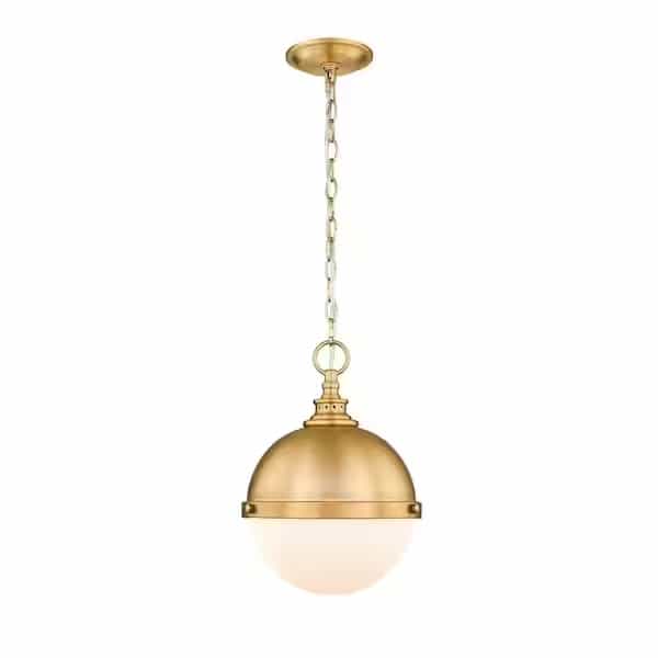 Retro influences shine through in this restoration style 2-light pendant, designed with an elegant and eye-catching globe shape lantern. The moon shape lantern offers extra dimension with its iron dome cover detailed with petite decorative rivets along the band that create a vintage-inspired industrial feel. The smooth classic brass finish of the main elements of this charming traditional pendant lend a classical flair, matched only by a rounded opal glass bottom shade that puts out a softly diffused glow.