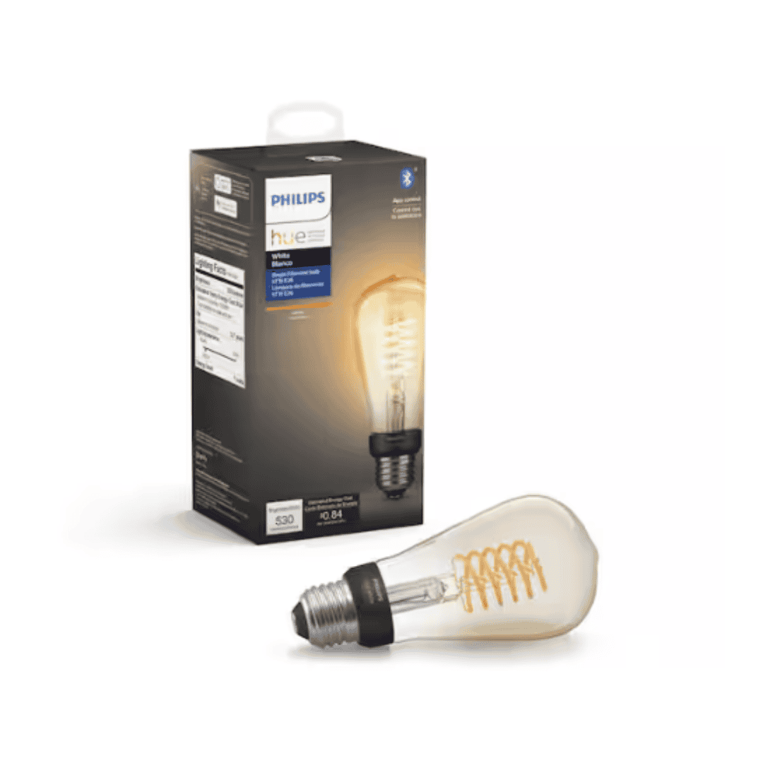 Enhance your smart lighting setup with the Hue White Filament E26 ST19 bulb. This vintage-style smart bulb features a glowing coiled filament and a transparent globe, combining classic Edison charm with modern smart control. Fully dimmable, it can be controlled via Bluetooth or paired with a Hue Bridge to unlock the full range of smart lighting features, including timers, routines, remote control, and integration with motion sensors or smart switches.
