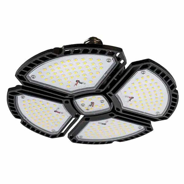 Pinegreen Lighting Deformable LED Garage Light Bulb uses advanced SMD LED chips, generates 15,000 Lumens of brightness using only 100-Watt, saving you about 85% less energy than the traditional incadescent equivalent. The 4 adjustable light heads allow you to modify the illumination at your will. You can either fold the panels flat for focused downlighting, or tilt them up for area lighting. The sturdy construction and die-cast aluminum heat sink design ensures good heat dissipation and long lifespan (up to 50,000 hours). This light is great for garages, workspaces, attics or any space that needs extra light.