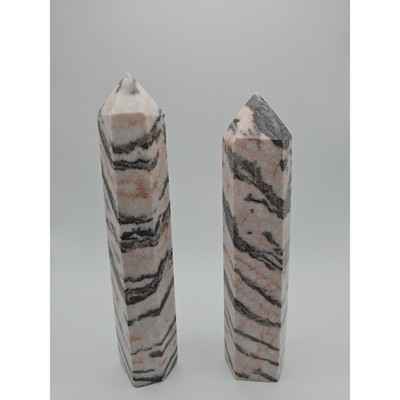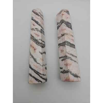 This beautiful pair of Pink Zebra Jasper generators weighs 2.37lbs and is perfect for any crystal collector. Sourced from Madagascar, these crystals are known for their unique patterns and stunning colors. The pink and black stripes make for a striking contrast, creating a one-of-a-kind display piece.