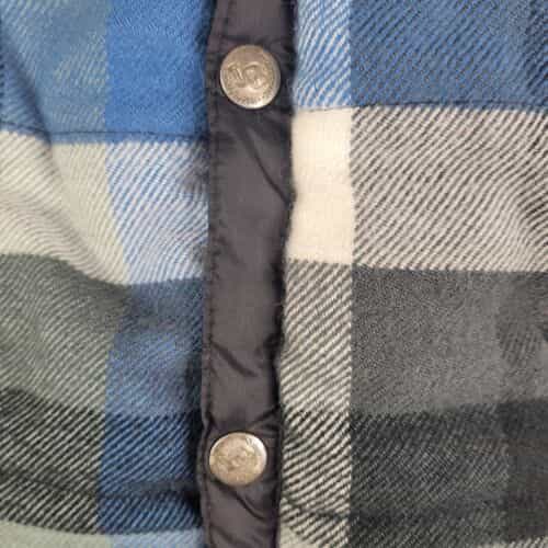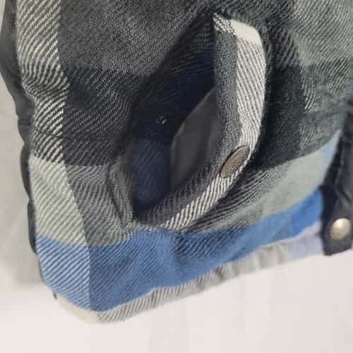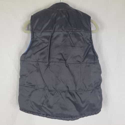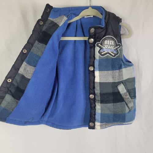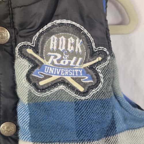 Blue, black, and gray plaid puffer vest with a fun “Rock & Roll University” patch!