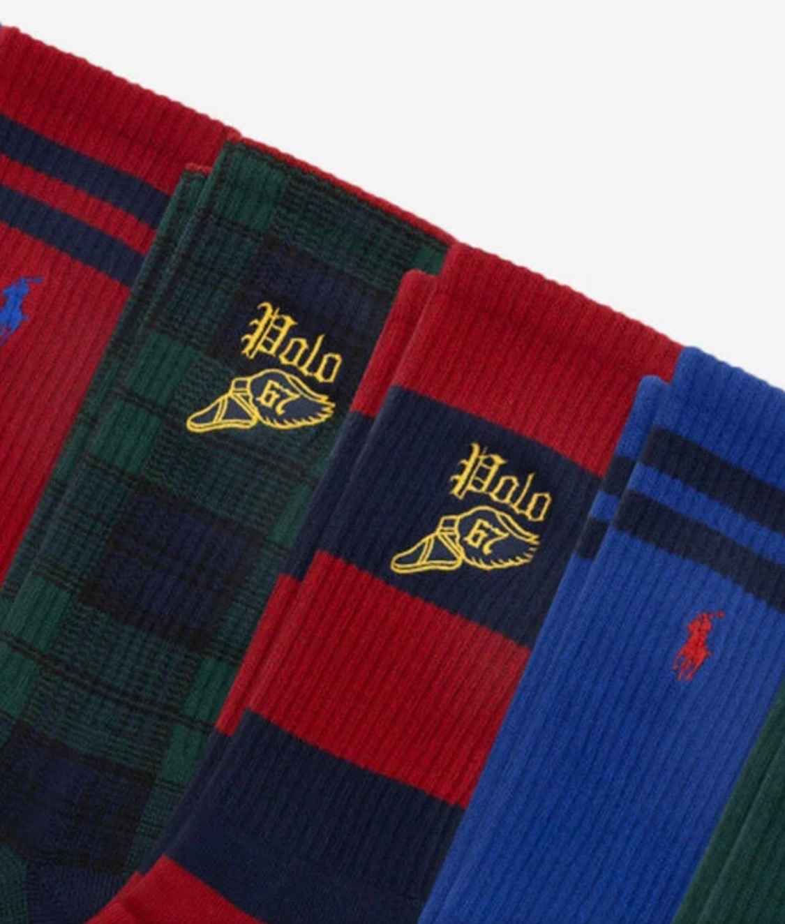 Exuding Collegiate-Inspired Style The Crew Socks In This 6-Pairs Set Feature A Mix of Striped And Plaid Designs As Well As An Embroidered “67” Winged-Foot Logo Graphic That Nods To Our Founding Year.