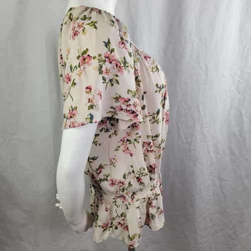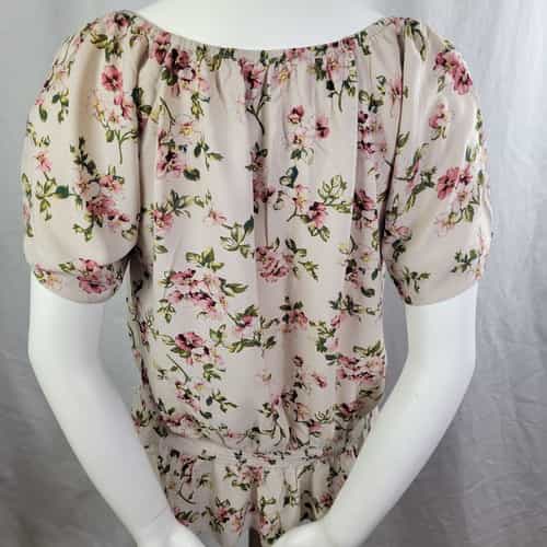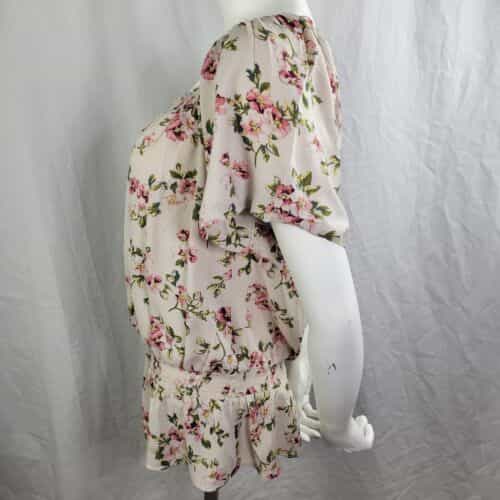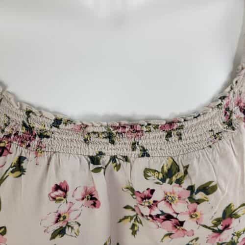 Pretty floral print top with a smocked collar and waist! Short raglan sleeves and a lightweight material make this a great summer and spring wardrobe piece!