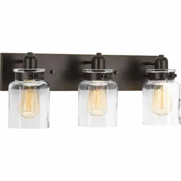 - Manifest an atmosphere of positive energy by relishing in the warm glow created by the Collection Antique Bronze Three-Light Farmhouse Bath Vanity Light ideal for any bath or vanity setting.