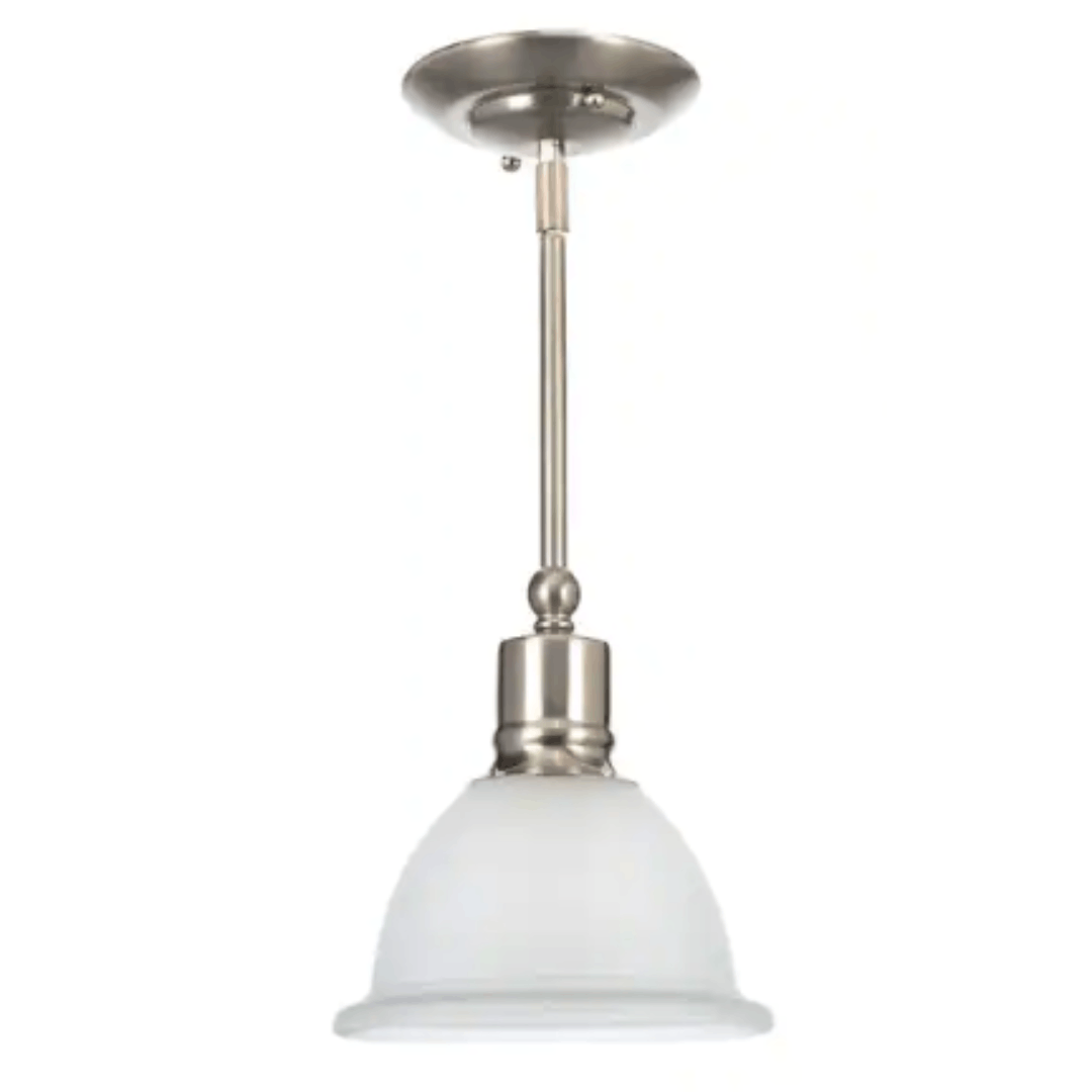 blends timeless style with modern versatility. This 1-light mini pendant features a brushed nickel finish and an elegant bell-shaped etched glass shade. It can be mounted facing up or down to provide either uplight or downlight based on your preference. The fixture includes multiple stem lengths and a 90° hang-straight swivel, making it ideal for both flat and sloped ceilings.