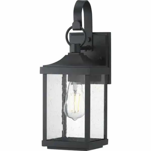 Help simplify the process of creating a home you love with the charming character of the   Collection 1-Light Small Wall Lantern. A modern lantern silhouette attaches to a textured black backplate that makes the versatile design compatible with a variety of exteriors and interiors. Clear seeded glass panels add a pinch of unexpected visual interest that nods to the light fixture’s modern farmhouse inspiration.