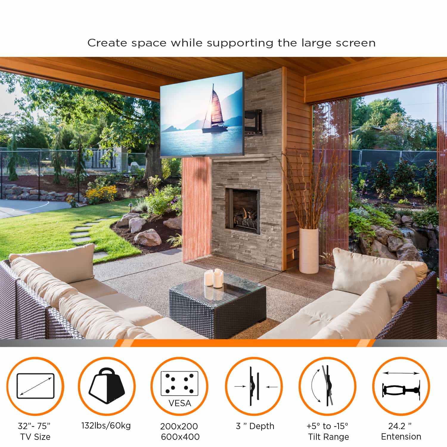 Introducing the ultimate Outdoor TV Mount by ProMounts – perfect for those looking to upgrade their home entertainment system! This low-profile design is easily extendable and is equipped with a 180-degree full-motion design, making it easy to adjust and easily carry your LED, LCD, or smart TV. This wall-mount TV bracket features a sturdy construction, making it suitable for indoor and outdoor surroundings. It accommodates 32″-75″ TVs, weighing up to 132 lbs and 200×200 to 600×400 VESA pattern. It offers an impressive degree of tilt adjustment between +5° to -15° so you can always enjoy the perfect viewing angle. Highlighted by an extendable arm up to 24.2″ and low profile design as low as 3″, makes this TV mount is a perfect solution for small spaces. The quick-release design allows for a fast and easy installation. Our wall mount also includes a built-in cable management feature to organize and maintain a clean look at all times. This full-motion TV mount is ideal for indoor and outdoor use and has all the hardware required for installation.