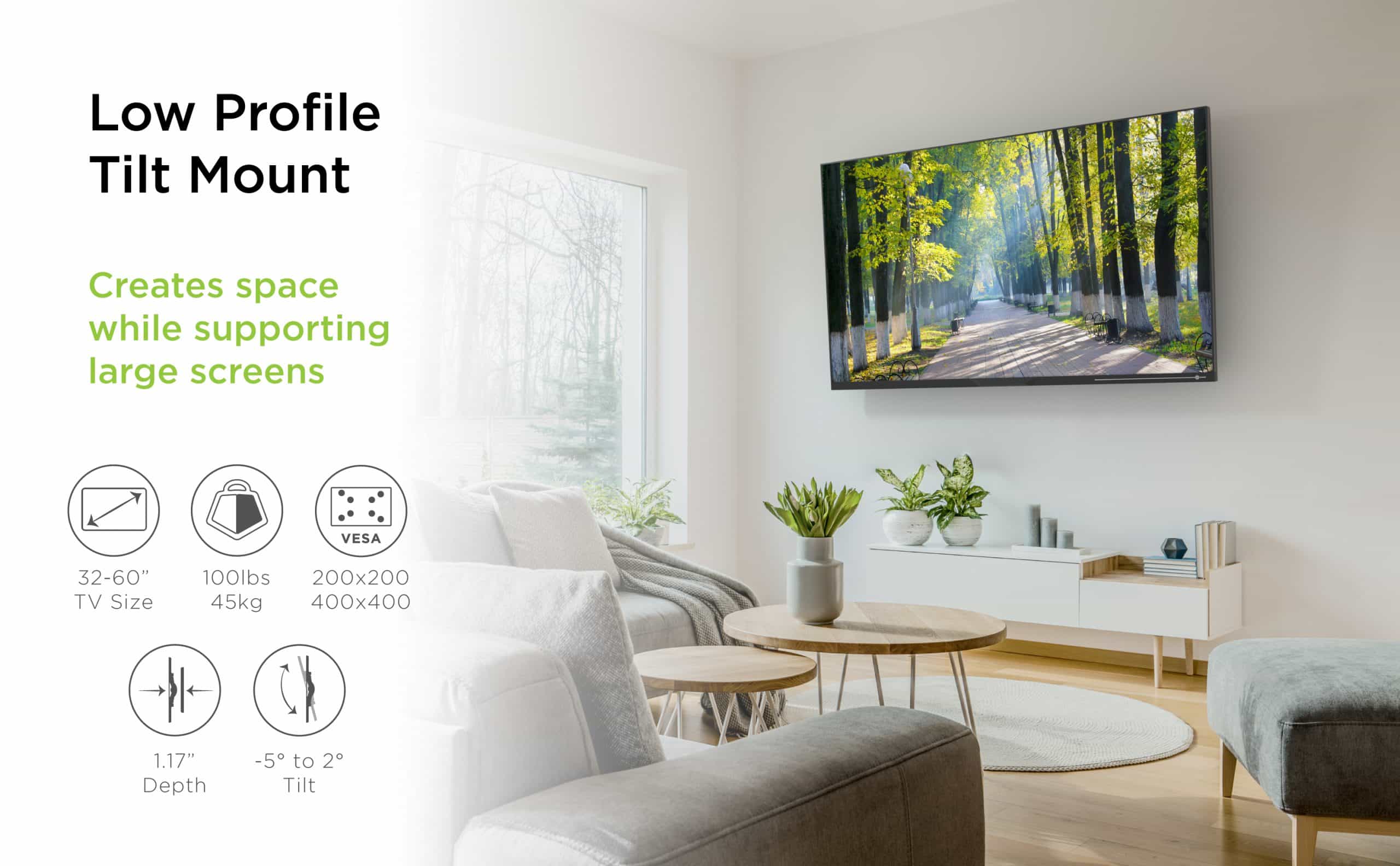 The MT442 is an ultra-low-profile tilt mount that can support most screens 32”-60” in size and weighing up to 100lbs. Unique universal mounting brackets come standard to give a wide range of compatibility with various television brands. For guaranteed compatibility cross compare your VESA pattern with the one found here. If these two numbers match or if your VESA pattern falls between them, you are ready to rock. Many features await within the MT442. From a fully assembled, open back wall plate that allows for easy cable management, to a quick release device that allows you to remove your screen in an instant. An audible locking mechanism means you know that your screen is always locked into place and secure. Quality steel with a black matte finish and a slim 0.8” profile gives a clean modern feeling. This allows you to enjoy your television the way it was meant to be, with total immersion that keeps the hardware hidden and gives you a viewing experience fit for your home. The MT442 is made for a higher viewing angle or for a space where screen angle adjustment is necessary. The MT442 features a vertical tilt range that allows for angles between -8° and 0°, making the perfect view for your home a reality. If your home has a fixed viewing angle or multiple viewing areas, consider a flat or full motion mount instead.