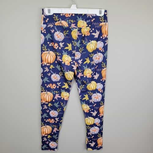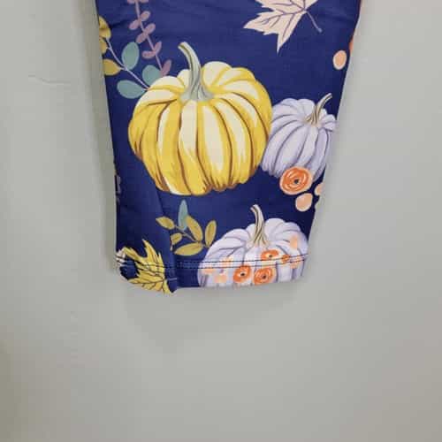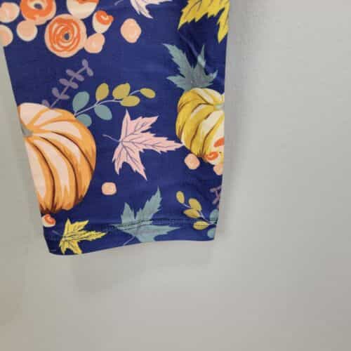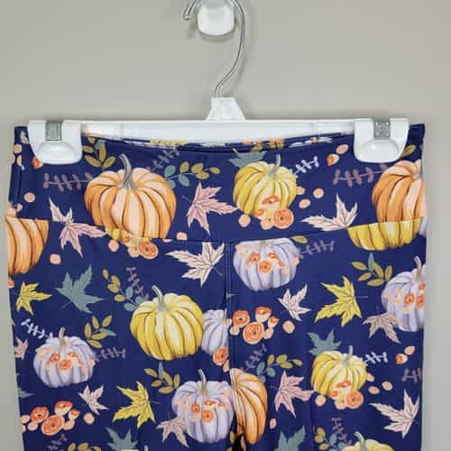 Soft and comfy pair of navy leggings made of polyester and spandex with pumpkins in different colors and a wide waistband!