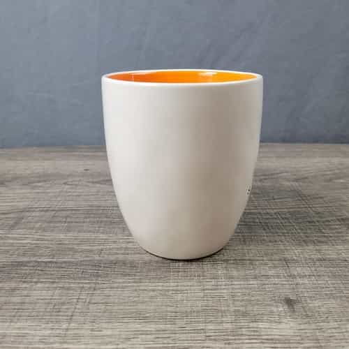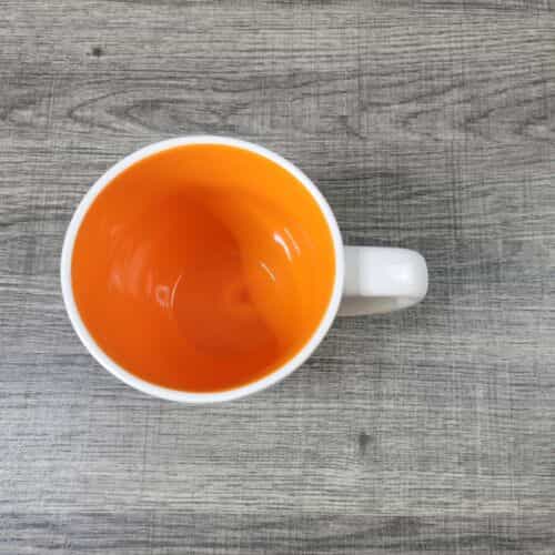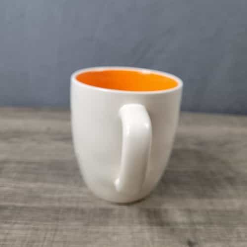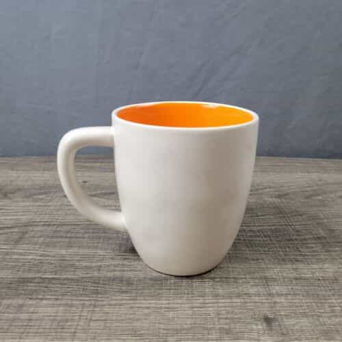 White ceramic mug with an adorable orange cat dressed in a bat costume, perfect for sipping your favorite hot or cold drink!
