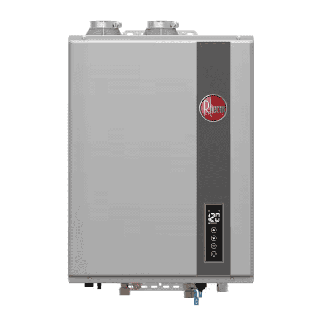 - Heats water only when needed to help reduce energy use, with condensing technology that provides up to 52% greater efficiency than a standard 50-gallon gas tank water heater