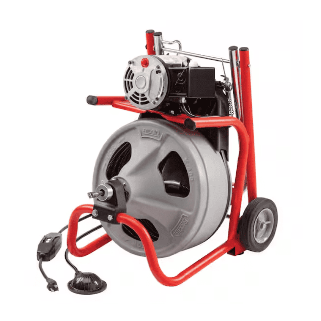 Handle tough drain cleaning jobs with this 120-volt drum-style drain cleaning machine kit. It features a compact, user-friendly design with an induction-style belt motor that runs at 165 RPM, manual controls, and a solid-core cable. The corrosion-resistant drum includes 75 ft. of 3/8 in. diameter rugged, kink-resistant solid-core cable suitable for clearing common 1-1/2 in. to 4 in. drain line blockages in tubs, showers, and sinks, and is ideal for 1/2 in. to 3 in. drain lines. An integrated transport cart with large heavy-duty wheels helps move the unit over bumps and stairs, while the fold-over handle improves portability and storage. If the tool head becomes lodged, the built-in cable control system stops the drum to help reduce cable flip-over and also indicates when blockages are encountered.