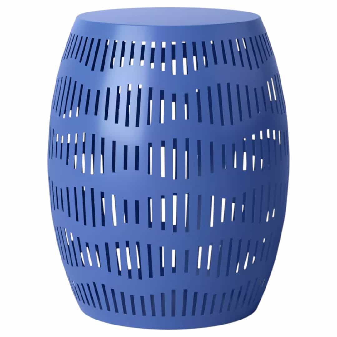 Enhance outdoor settings with this metal accent table, designed in a barrel-like shape with a flat top for holding drinks or small items. Finished in a solid blue color with cutout pattern detailing, it offers a blend of visual interest and practical surface space for patios, gardens, or balconies.