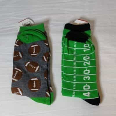 Brand new manly socks! One pair covered with footballs and the other is a replica of a football field! There is still time left in the season to sport these special socks so grab them quick!