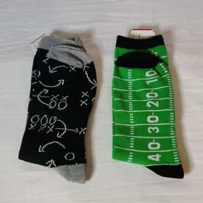 Brand new manly socks! One pair is a replica of a football field and the other is covered with plays! There is still time left in the season to sport these special socks so grab them quick!
