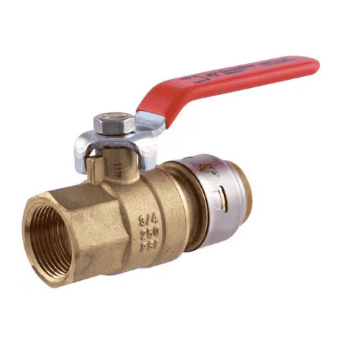These push-to-connect ball valves provide a fast, simple way to install a new or replacement water shut-off valve. A redesigned stainless steel collet retainer adds strength and durability and supports a 250 psi pressure rating. The updated body design allows the pipe to be inserted with less force, and no tube liner is required for PEX. A single-lever quarter-turn handle provides quick control of water flow, especially in tight spaces. No soldering, clamps, unions, glue, or special tools are required. After the pipe is inserted, stainless steel teeth grip it securely while an O-ring compresses to create a watertight seal. The valve can be rotated after installation for adjustments, and it can be removed using a disconnect tool for replacement or reuse.