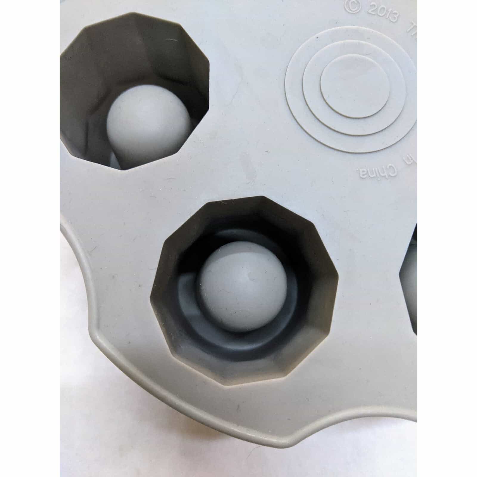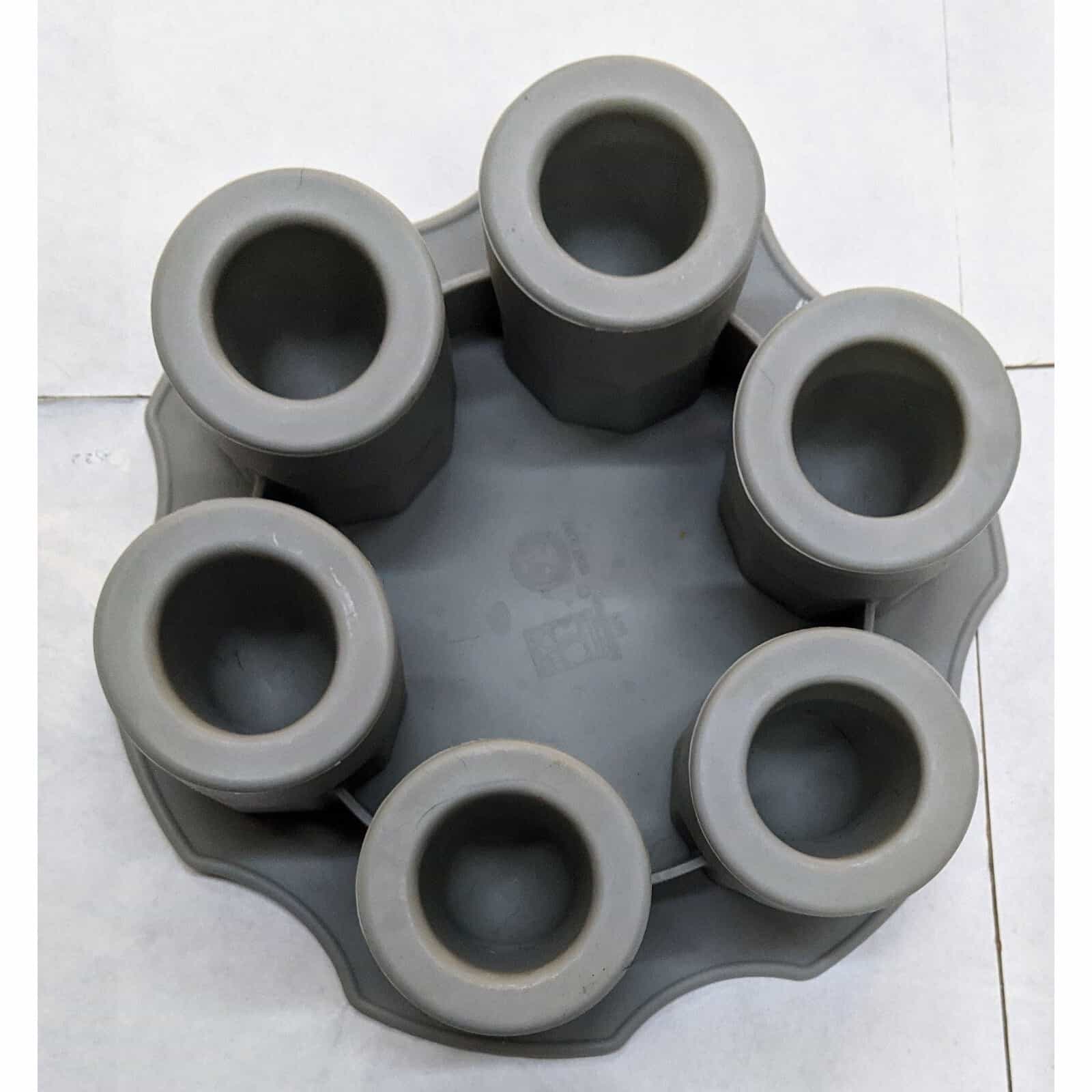 This ice tray contains 6 spots to pour water and make ice cubes that come out shaped as shot glasses. Great for parties! Made by Thinkgeek.com in 2013. Made out of rubber so it is dishwasher safe and food safe. It is still in very good condition. It is a grey color.