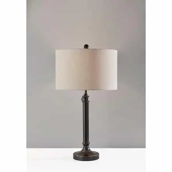 Set the Barton Table lamp on your living room console or nightstand for a touch of modern farmhouse vibes. Modify the lamp to fit your space with a decorative joint on the pole that adjusts the height from 26 in. to 34.5 in. An antique bronze metal finish paired with an oatmeal linen fabric shade brings warmth to any space. Turn the lamp on and off with a rotary switch on the socket.