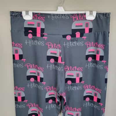 Soft and comfy pair of leggings made of polyester and spandex with a slightly offensive but fun camping reference print!