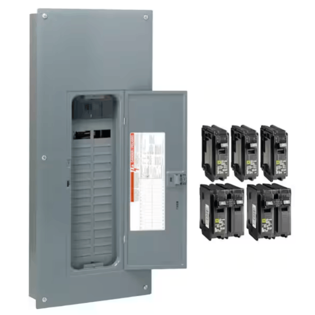- Includes: (3) HOM120 20 Amp single-pole breakers, (2) HOM230 30 Amp double-pole breakers, and a combination flush/surface cover