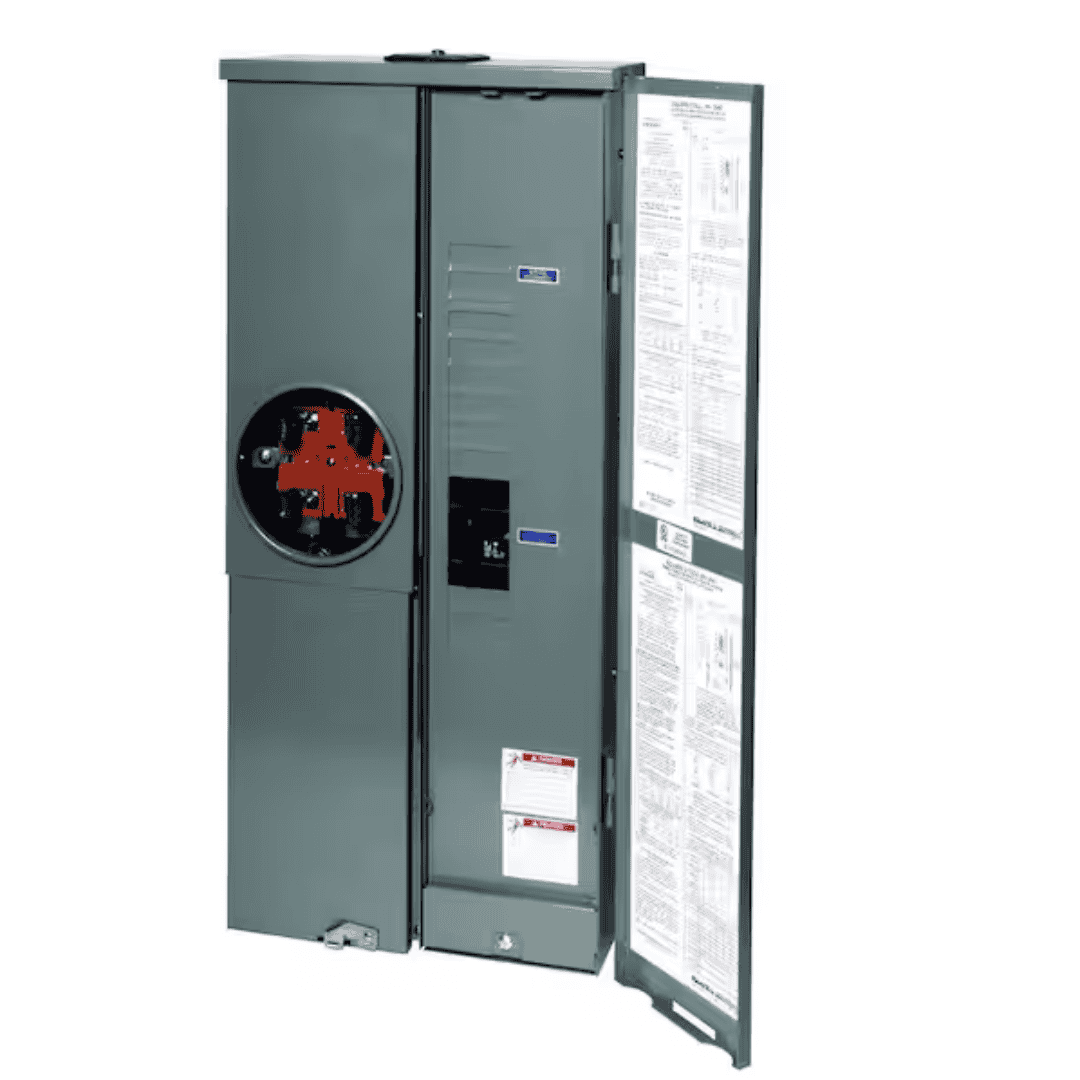 This 200 Amp 8-space 16-circuit outdoor combination meter socket and main breaker load center is designed for use as a combination service entrance device. It is ANSI certified and UL listed with a maximum 10,000 AIR rating. The unit includes a ring-type meter cover and a single-phase, 4-jaw meter socket. It can be used for either overhead or underground service applications and meets EUSERC specifications. It may be surface mounted or converted to semi-flush installation with the proper flange kit. Built with a plated aluminum bus bar, this load center is tested for compatibility with Homeline circuit breakers only. It is designed for contractors, remodelers, builders, and homeowners who want a practical and efficient installation solution. The unit is engineered to support faster installation and reduced wire usage.