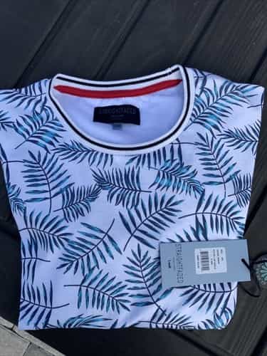 This shirt is white with blue palm leaves. It is new with tags.