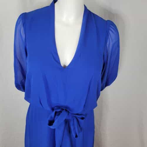 Beautiful royal blue v-neck dress with sheer 3/4″ sleeves, a blouson style top and a high-low tiered skirt!