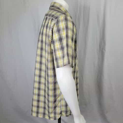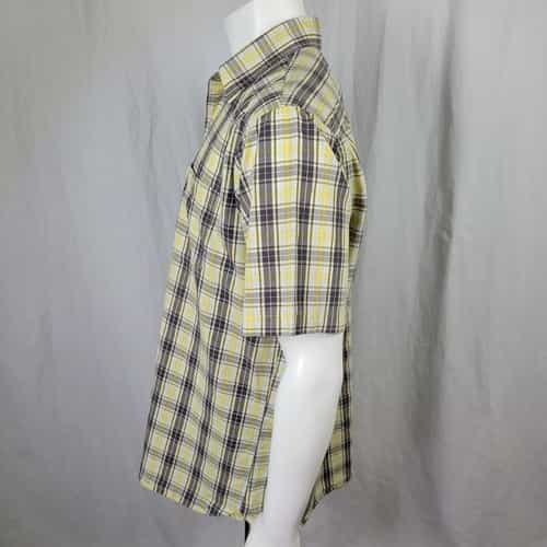 Basic button down collared shirt with a single button close breast pocket in nice blending shades of pale yellow and light gray! Perfect for business or casual wear and lightweight enough for summer or add a layer for the cooler months!