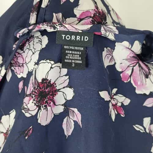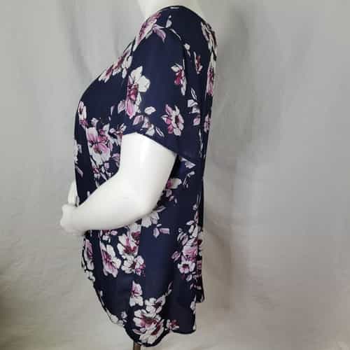 Pretty navy blue floral print free flowing blouse with a small keyhole opening and a pleated back!