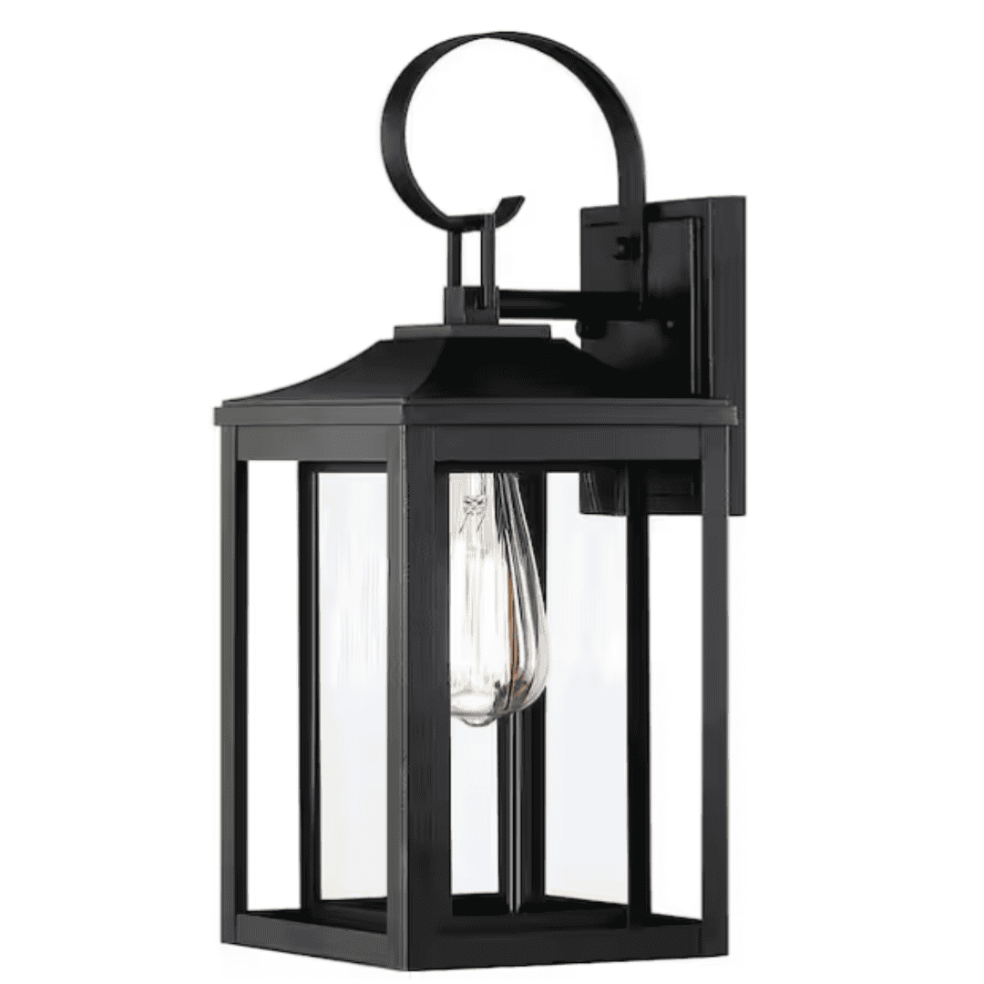 Brighten your front door, garage, or patio with this 1-light exterior lantern fixture. Rated for wet locations, it features a sleek metal frame with a powder-coated black finish that works well with classic, rustic, and farmhouse-inspired spaces. Four clear glass panels are enclosed within a clean-lined square frame for an open, polished look. A vintage-style E26 bulb is recommended to enhance the overall appearance and provide full illumination. Ideal for porches, patios, garages, decks, and other outdoor areas, this fixture is also compatible with a dimmer switch for adjustable lighting.