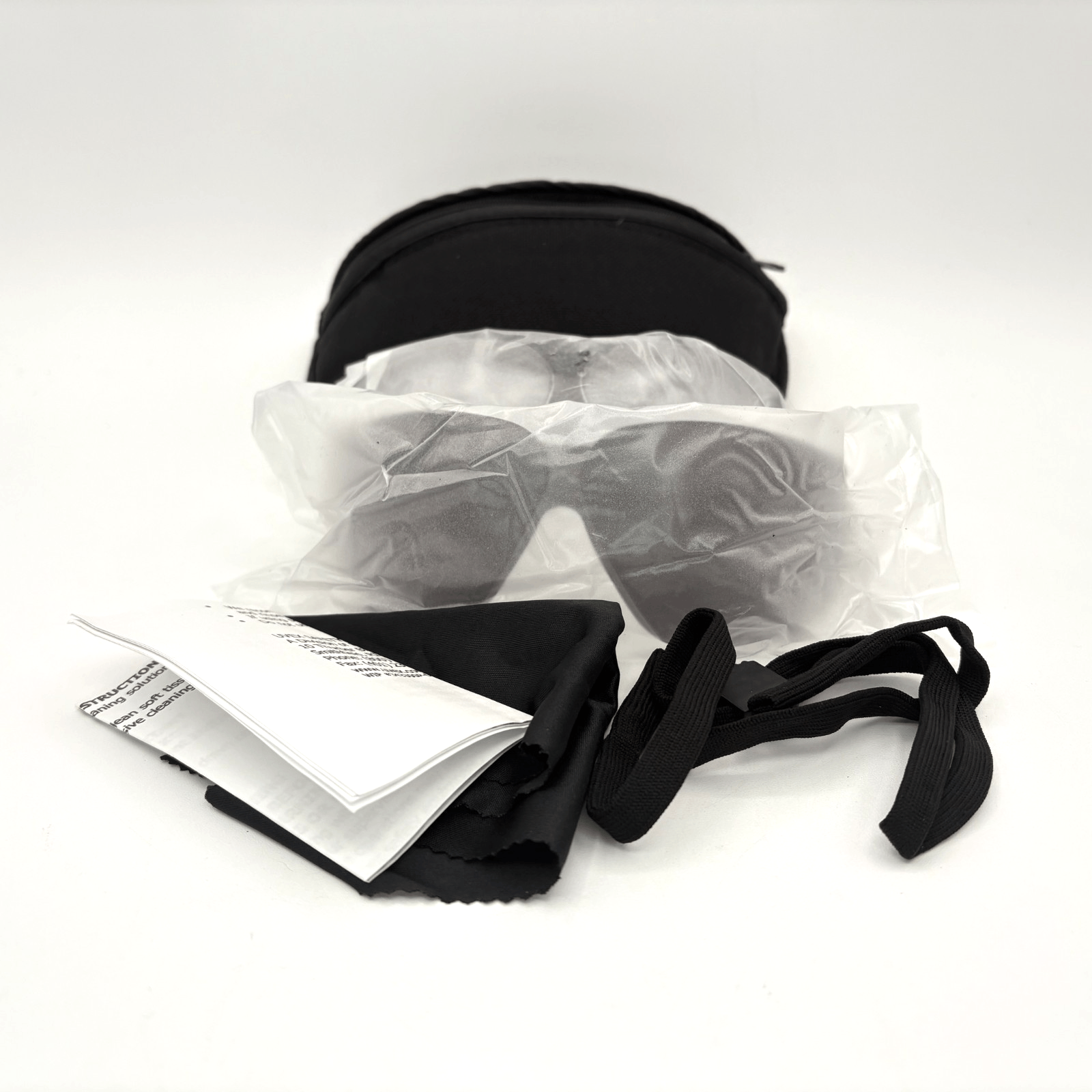 Includes frame with clear lens, sunglasses lens, cleaning cloth, case, strap, directions.