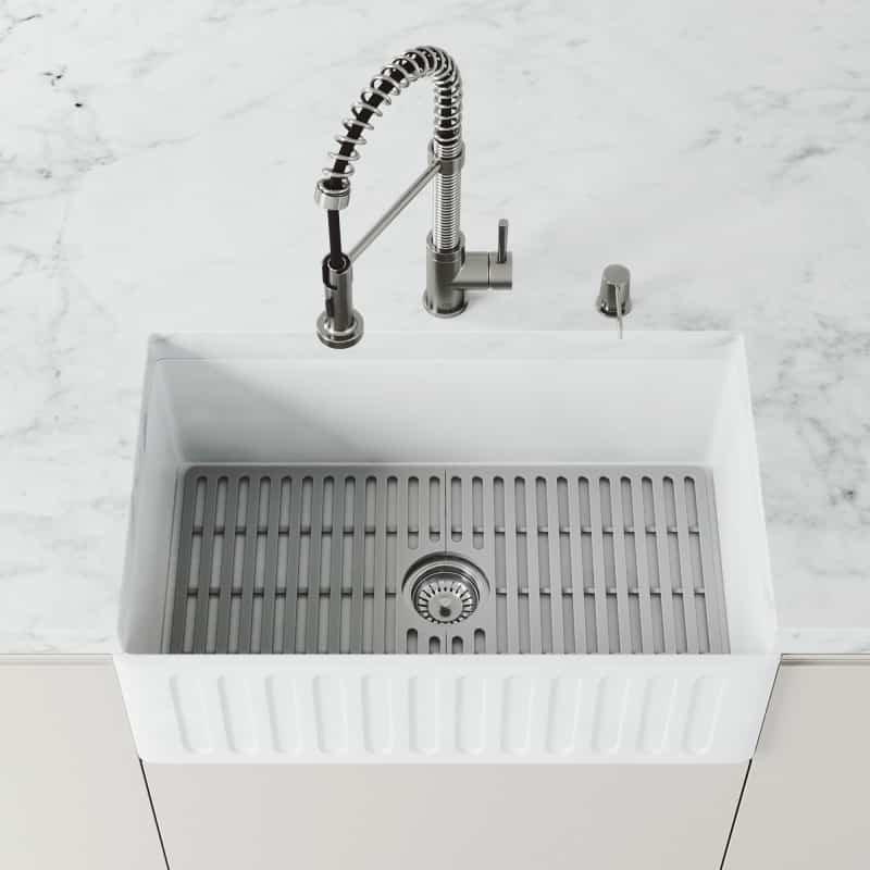 The first of its kind, the VIGO 27″ x 14 ¾” Gray Silicone Kitchen Sink Bottom Grid expertly protects the surface of VIGO’s 30” Single Bowl Matte Stone™ Kitchen Sinks. This flexible, rubber model sits inside the sink’s basin to prevent scratches from pots, pans, dishes, and cutlery. Heat-resistant up to 446° Fahrenheit (230° Celsius), this grid can be easily cleaned in the dishwasher. Its non-toxic material meets FDA Food Contact Regulations for consumer safety. Enjoy your VIGO Matte Stone™ Kitchen sink even more now with the VIGO Silicone Kitchen Sink Bottom Grid.