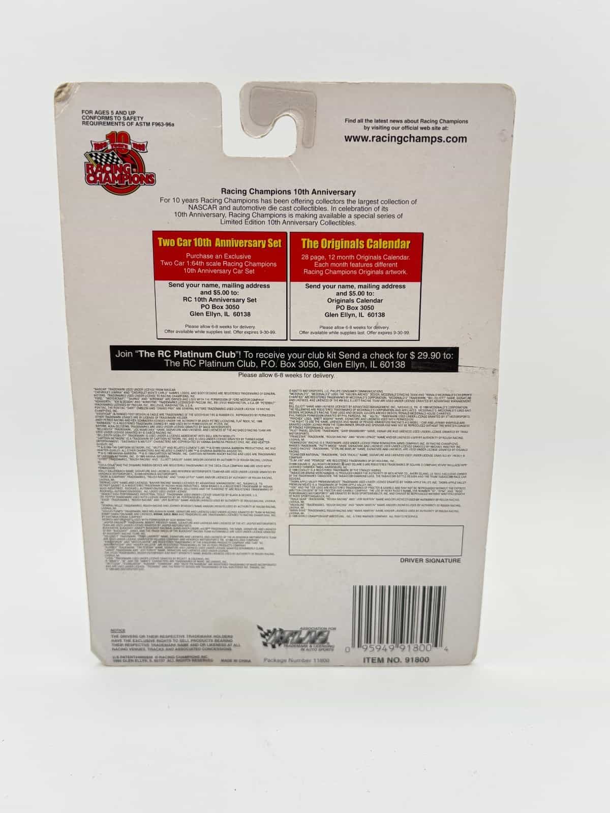 Vintage 1999 Sealed Racing Champions Die Cast Display Stand & Card Johnny Benson