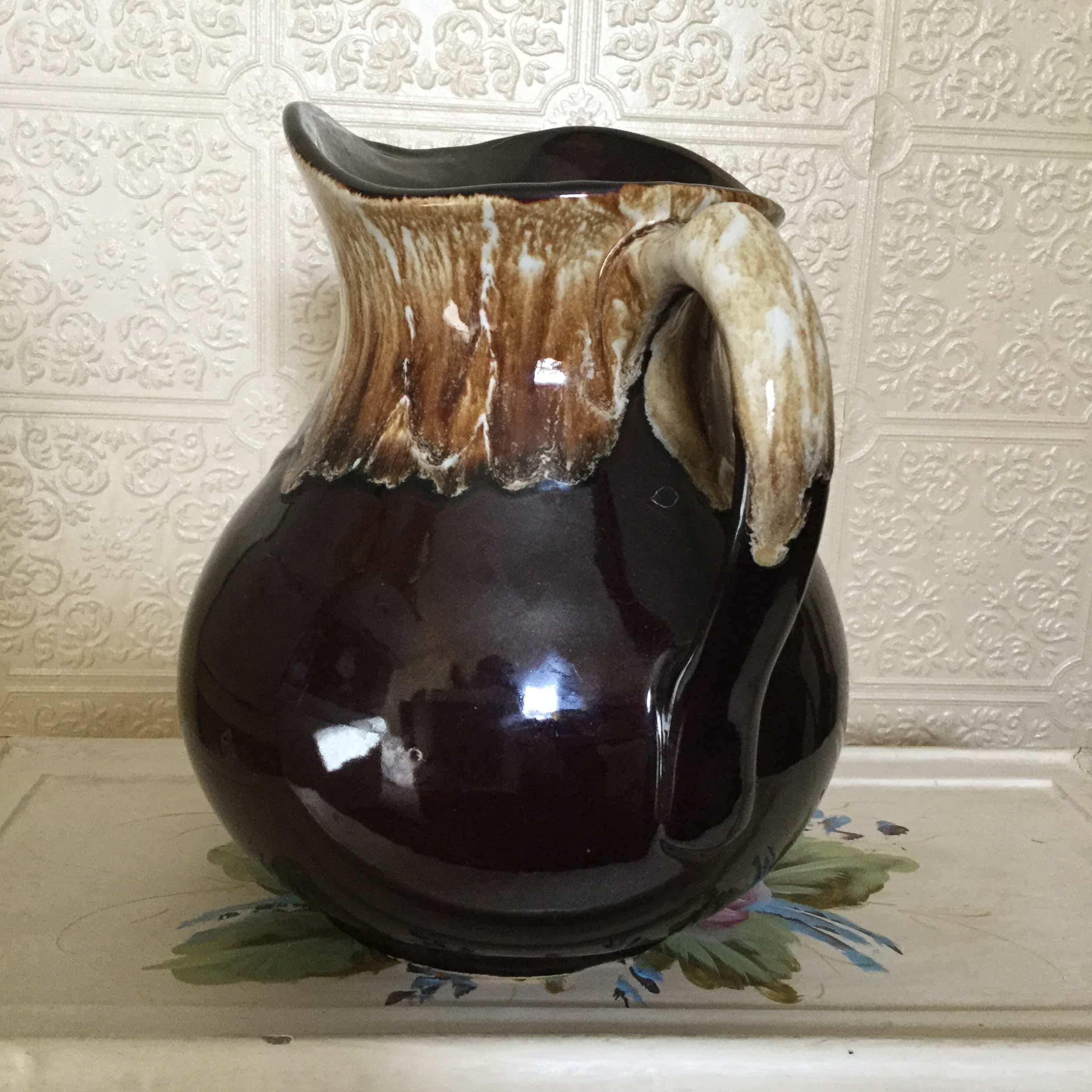 Vintage seventies brown drip glaze large water pitcher made in a pottery class, by the teacher.