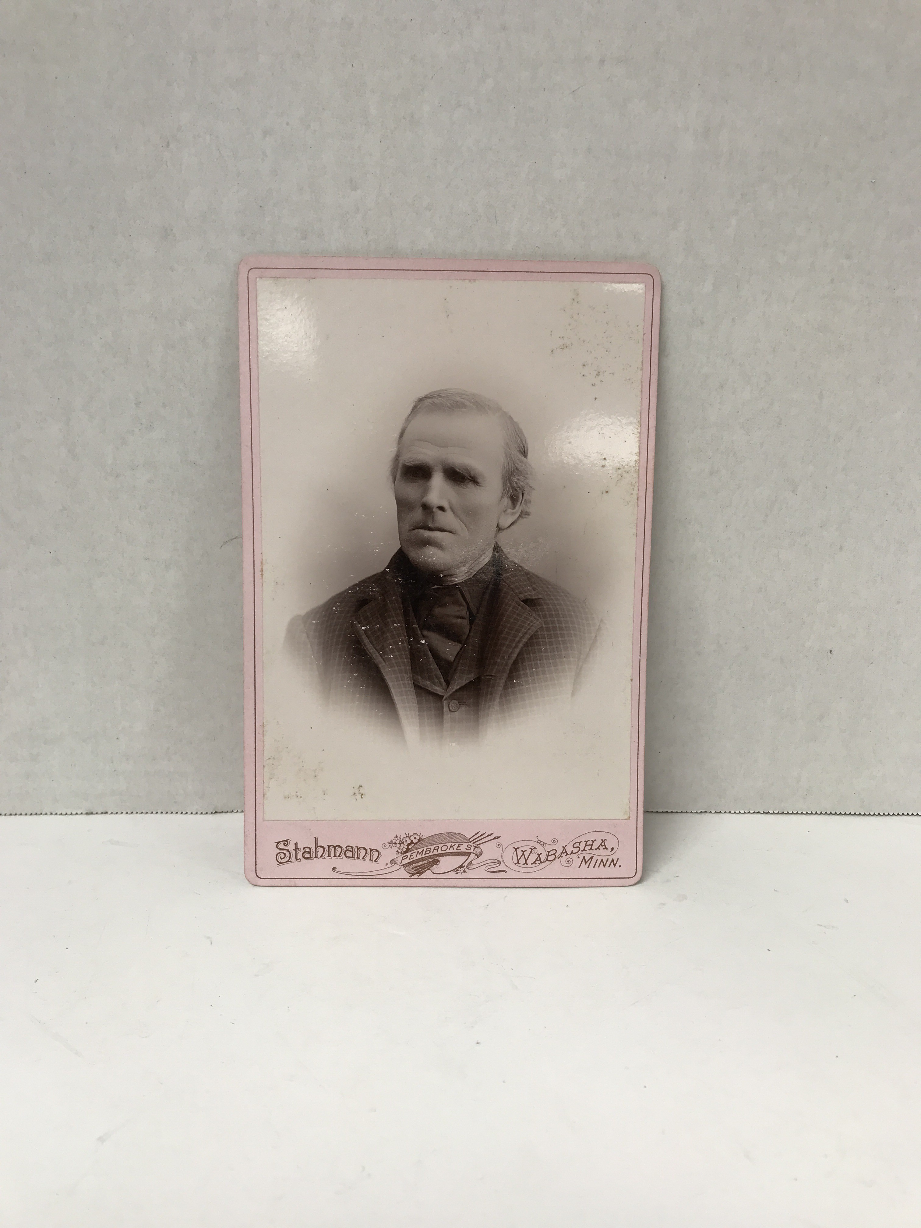 Old man looks like he has no teeth, is not smiling, but well dressed from Wabasha, Minn. cabinet photo is trimmed in pink crayon portrait style an was taken at Stahmann studio on Pembroke st.