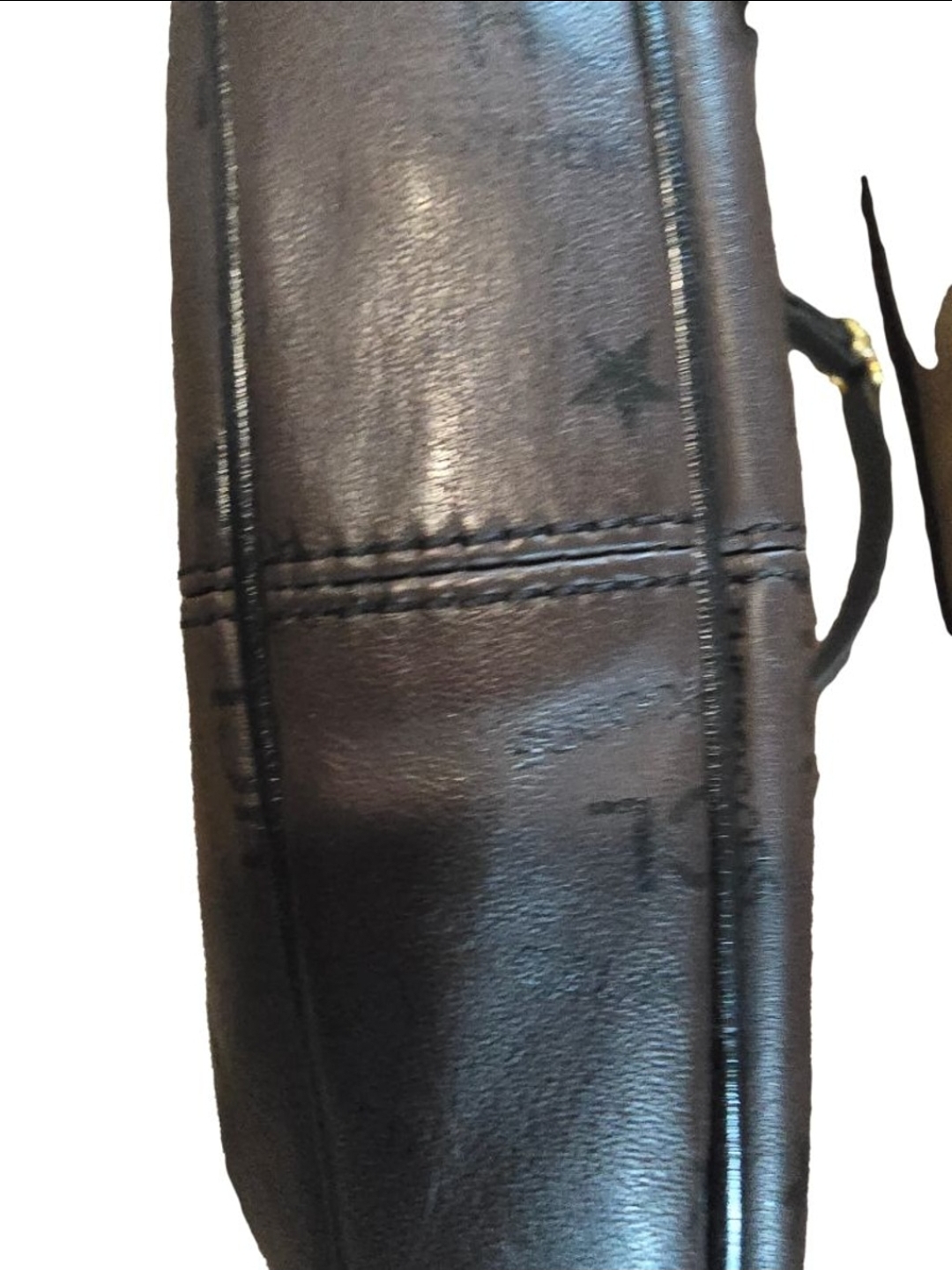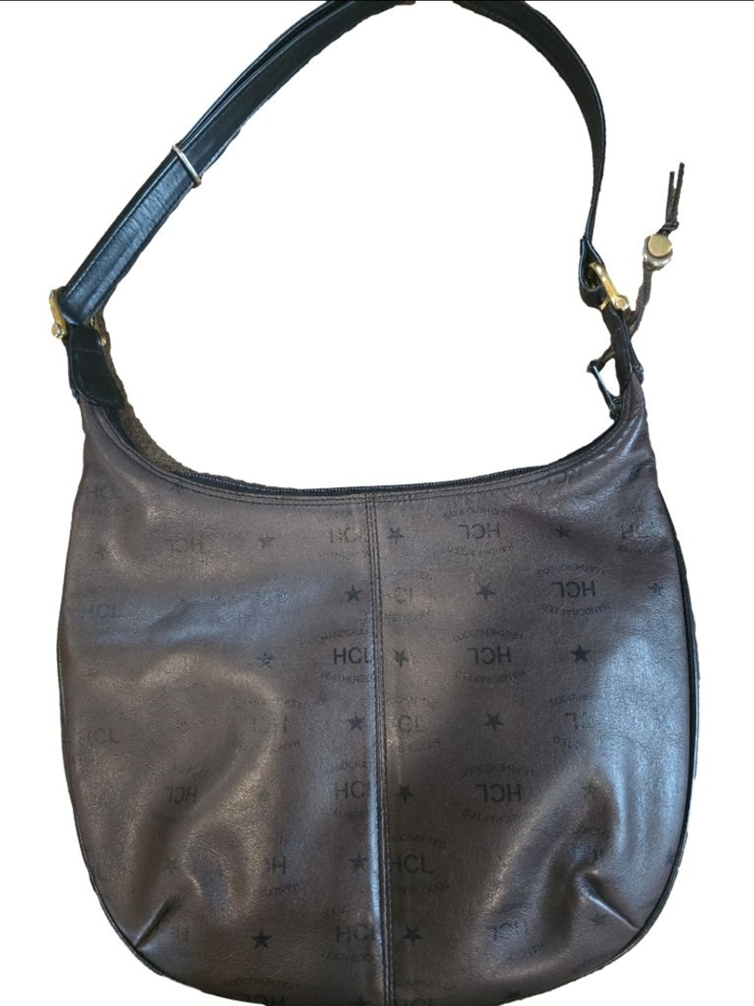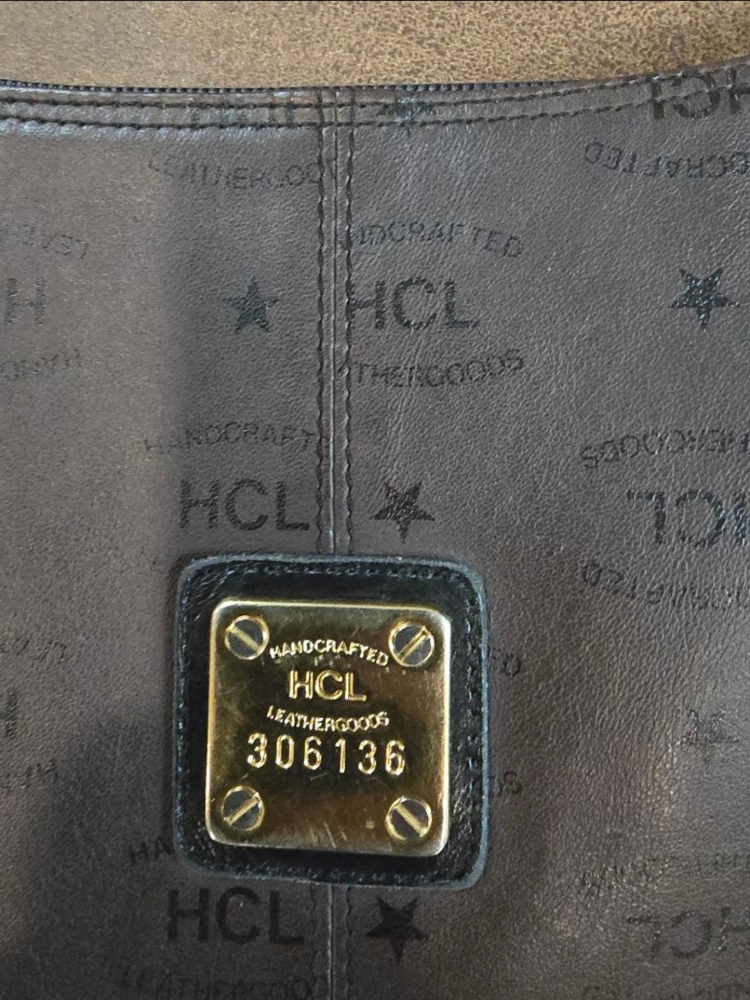 This HCL shoulder bag features a dark brown exterior with a subtle monogram pattern of “HCL” and stars. It has a black leather adjustable shoulder strap with gold-toned hardware. A gold-toned rectangular plaque on the front is engraved with “HANDCRAFTED HCL LEATHERGOODS 306136.” The interior is lined with a light brown, possibly suede, material and includes a zippered pocket with “HCL Germany Genuine Leather” visible. The bag appears to be in good condition with no significant visible wear.