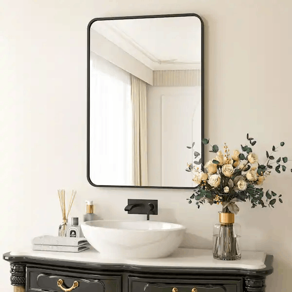 A classic style mirror with a modern round corner and aluminum frame. It’s ideal for the living room, bathroom and bedroom. Add elegance and highlight the beauty of space.