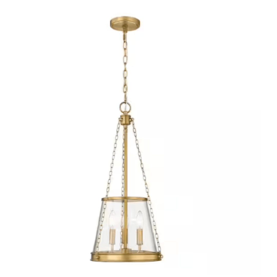 This petite 3-light pendant brings a stylish urban flair to kitchen islands and foyers. Combining classical and industrial design elements, it features a 3-arm candelabra within a clear glass shade that gracefully tapers upward. The warm rubbed brass finish adds a chic, metallic touch, making it a stunning accent for transitional or contemporary interiors.