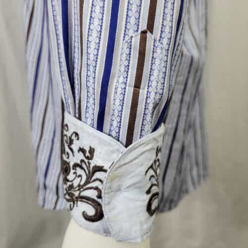Cotton button down blue and brown striped shirt with brown jacquard flip cuffs! Wear it untucked for a casual look or tuck it in for a more polished look!