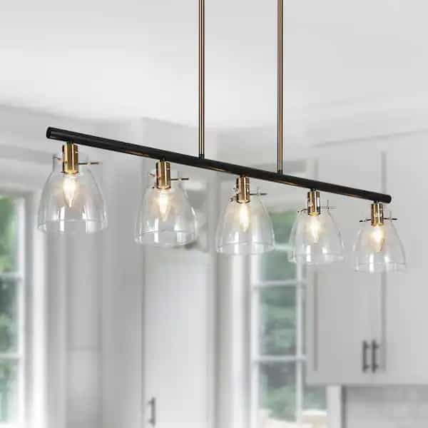 Create a new-fashioned, understated stylish house decoration with this 38 in. Large Modern Brass Hanging Light, 5-Light Black Island Chandelier for Dining Room with Bell Clear Glass Shades. With a simple linear rectangular design and bowled-shaped clear glass shades, this 5-light large pendant hanging light is fantastic to embellish your kitchen island, living room, bedroom, foyer, entryway, hallway, providing very ample and bright lighting. The adjustable down rods allow you to install this rustic black chandelier lighting at a suitable height to present the perfect visual effect.