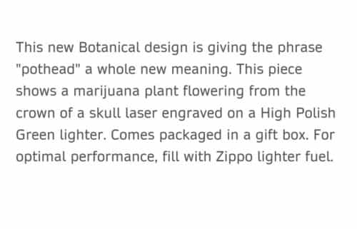 Elevate your lighter collection with this impressive Zippo 49142 Botanical Pothead Design Lighter. Crafted with fine attention to detail, this collector’s item features a stunning skull and gothic theme, making it a great addition to any collection. Made in the United States, this high polish green finish lighter boasts a brand name that speaks of quality and durability.