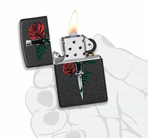 This Zippo lighter in black crackle finish features a striking design of a red rose and dagger tattoo. Made in the United States, this collectible piece is perfect for fans of skulls and gothic themes. With the iconic Zippo brand, you can trust in its quality and durability.