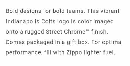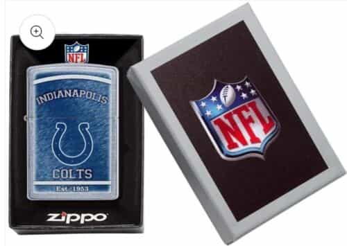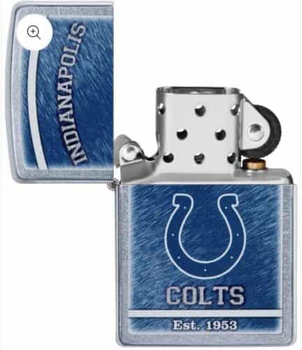 This Zippo lighter is the perfect addition to any Indianapolis Colts fan’s collection. With its street chrome finish and limited quantity, it is the ideal way to show your support for your favorite team while also getting a high-quality, reliable lighter. Made in the United States, this Zippo features the iconic Colts logo and is branded with the trusted name of Zippo.